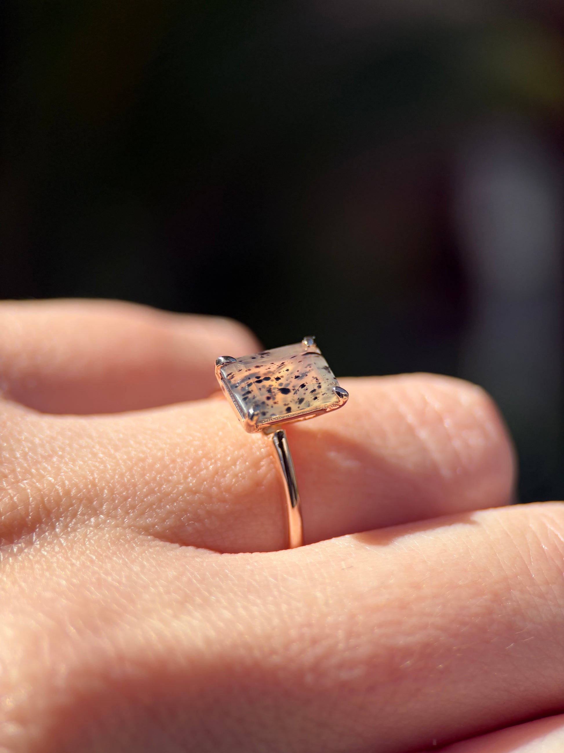 Ágata Montana corte esmeralda de 2.10 cts en oro rosa de 14k.