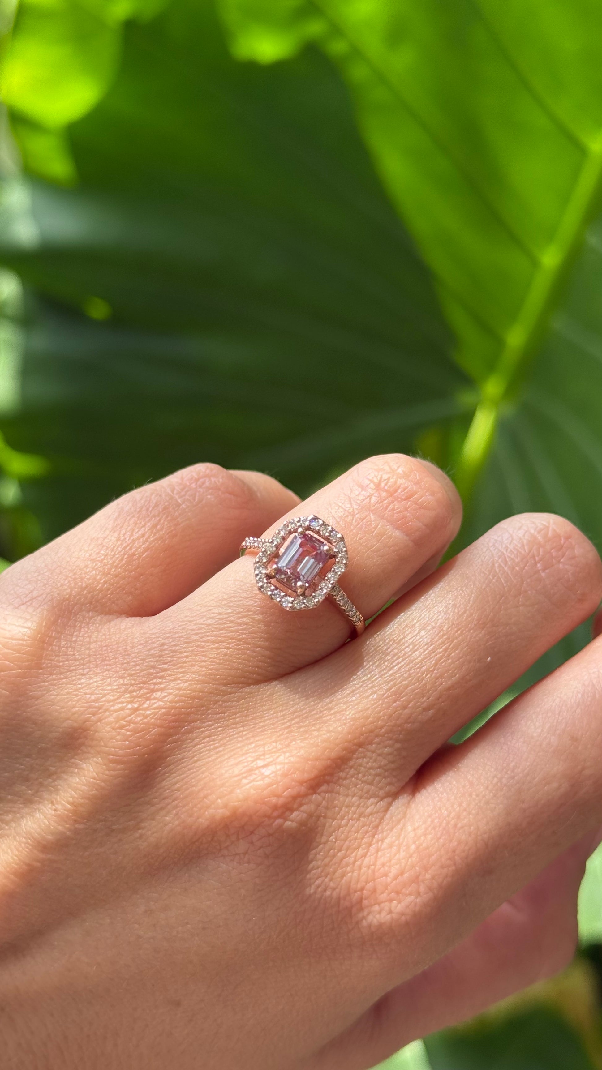 Anillo con Alejandrita corte esmeralda de 1.8 cts con halo y pavé de diamantes en oro rosa de 14k.