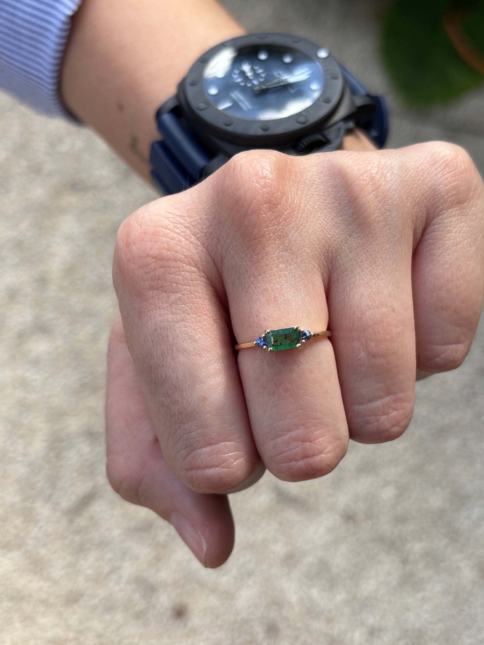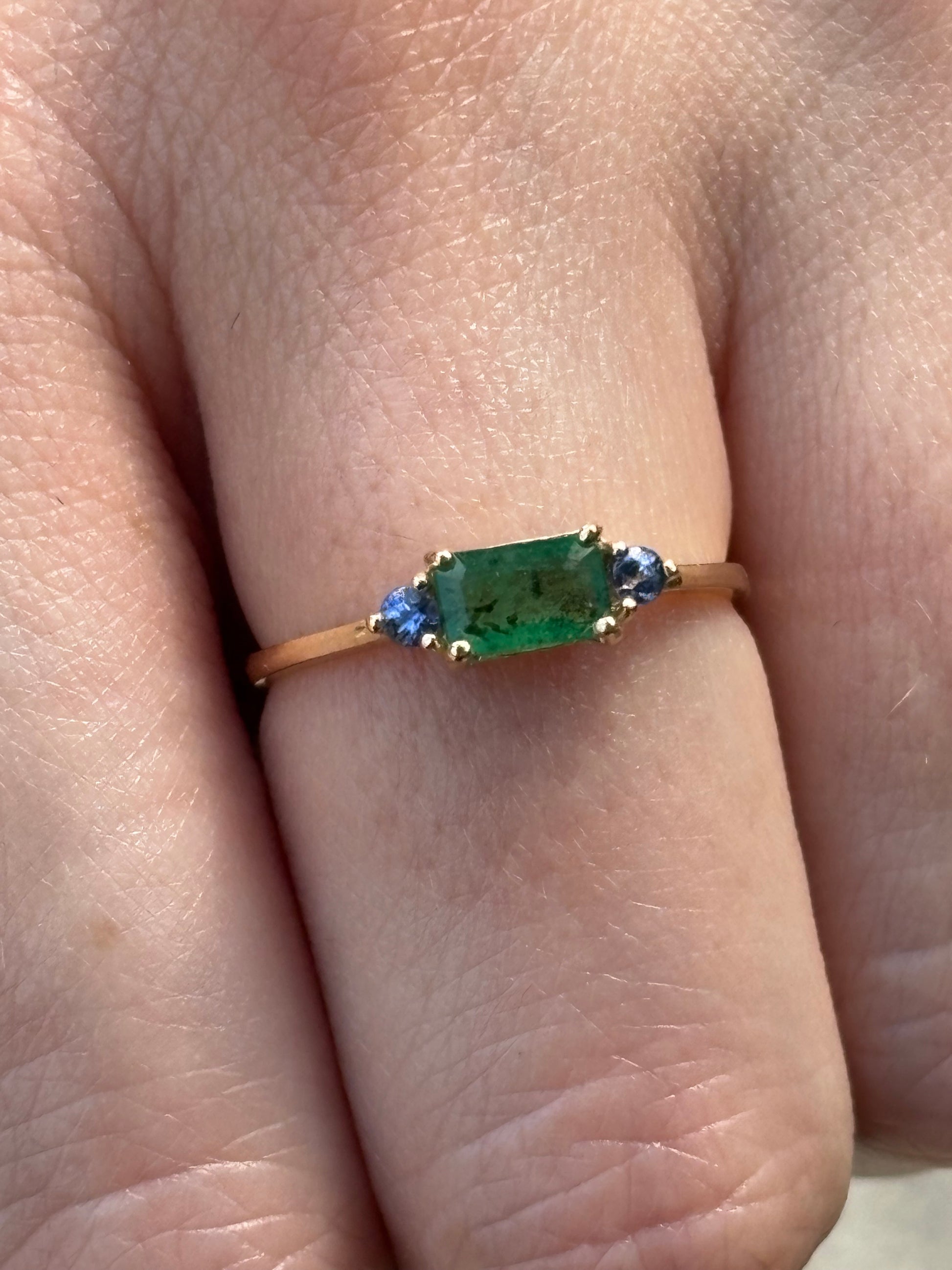 Esmeralda corte baguette horizontal con 2 zafiros de .03 cts cada uno.