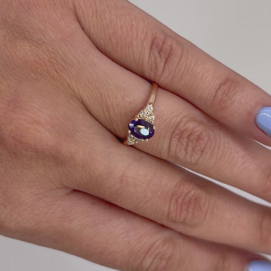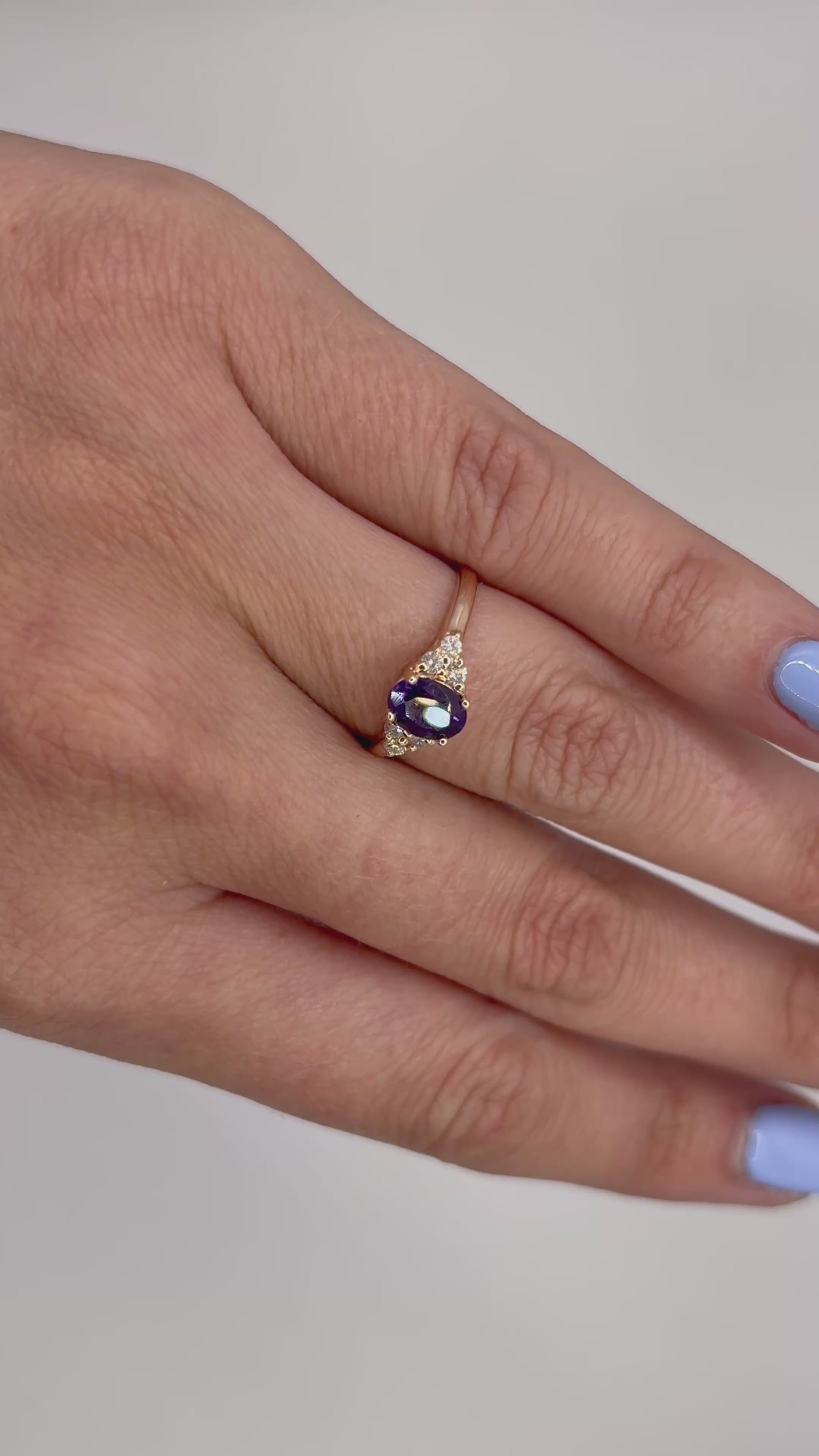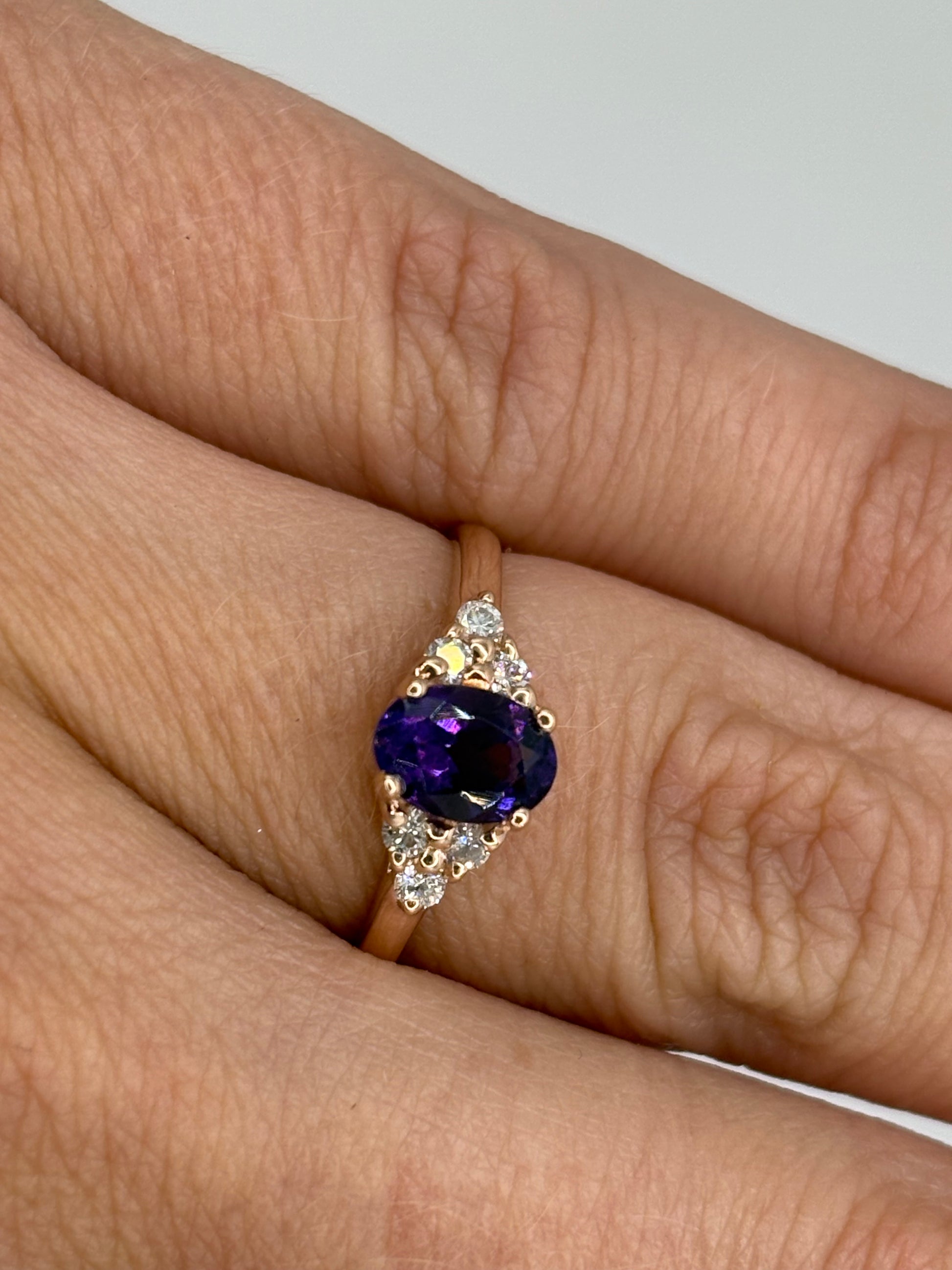 Amatista de 5x7 mm con .18 cts de diamantes en oro de 14k.