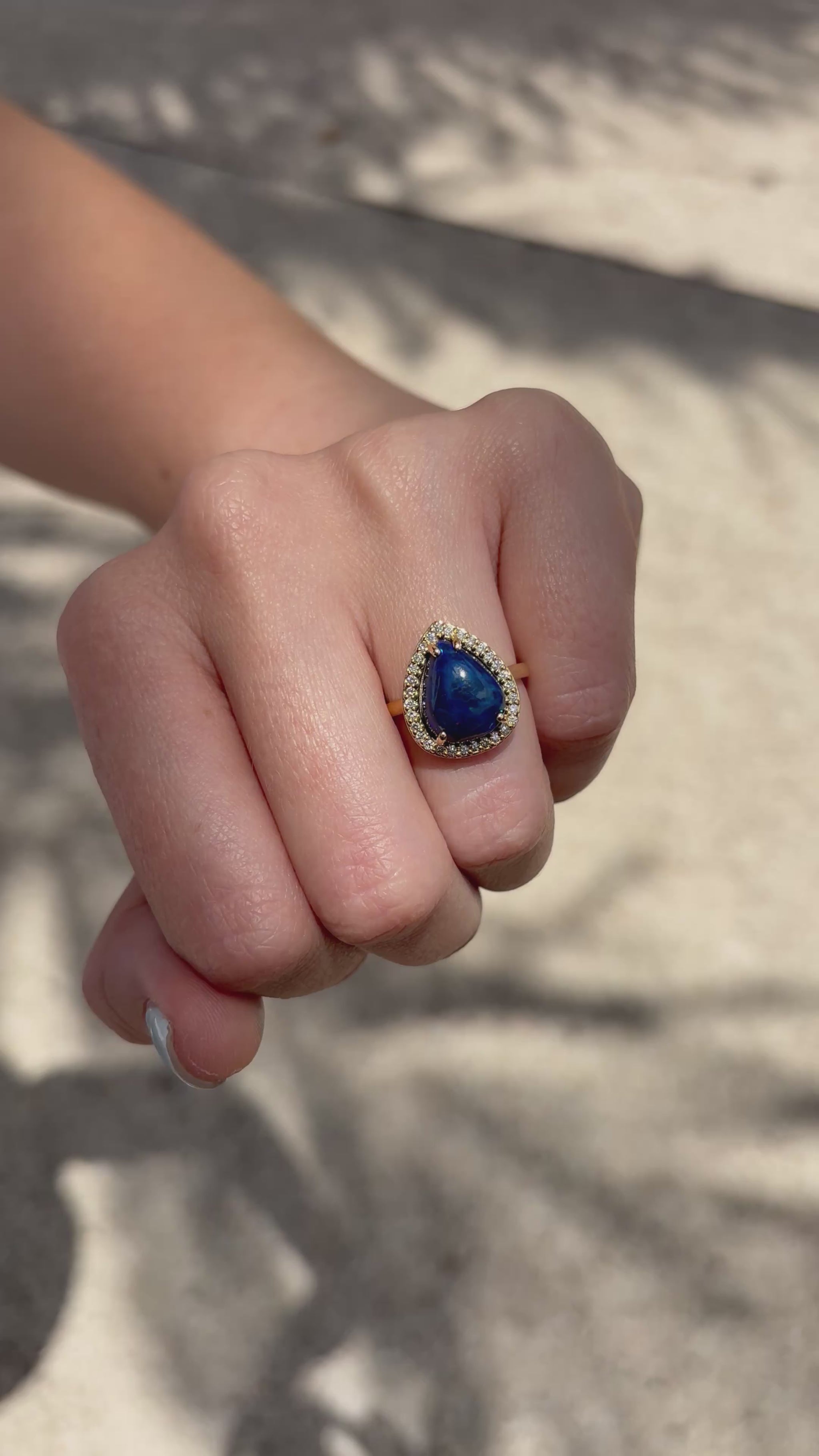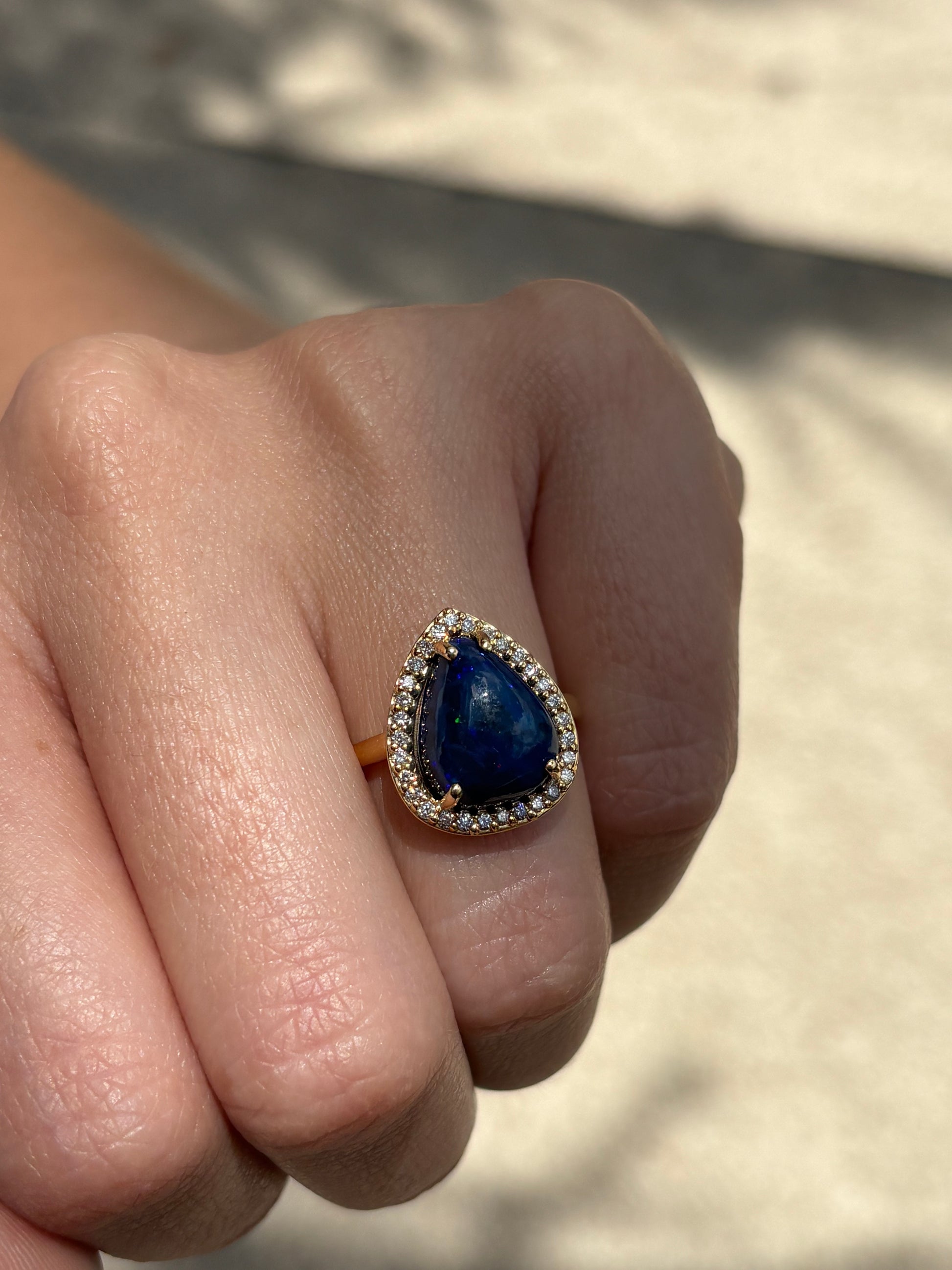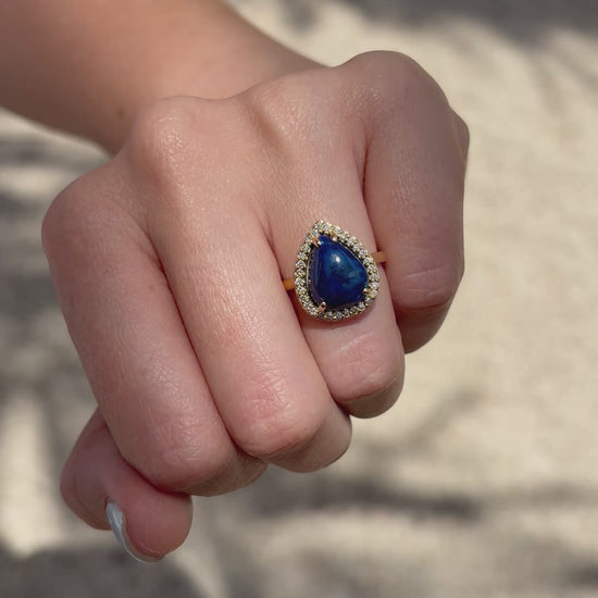 Opalo Australiano de 3.76 cts corte gota, con halo de diamantes de 0.1 cts c/u, en oro de 14k.