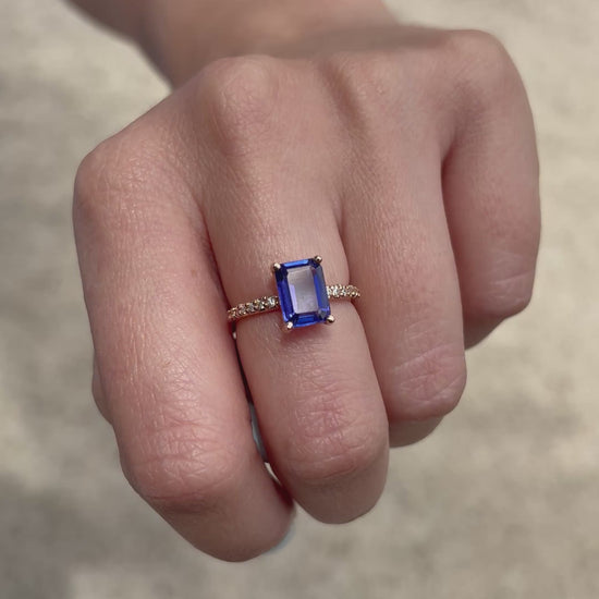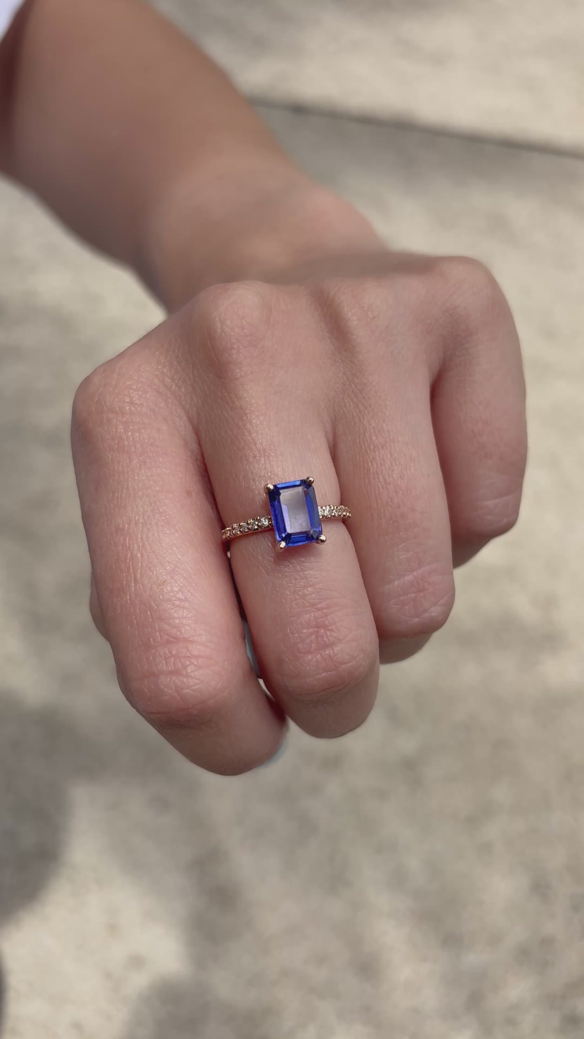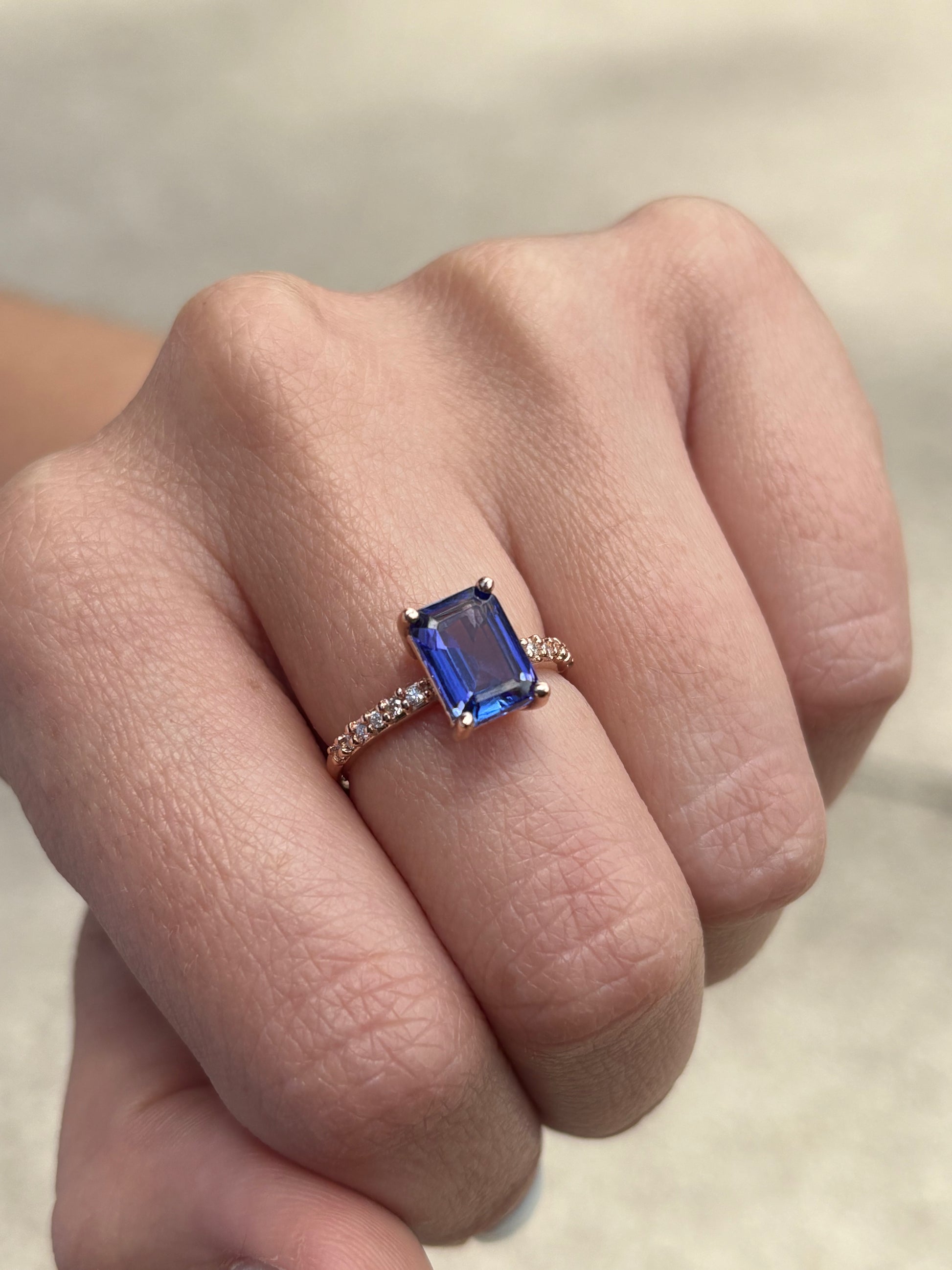 Tanzanita corte esmeralda de 2.4 Cts con pavé de diamantes, en oro rosa de 14k.