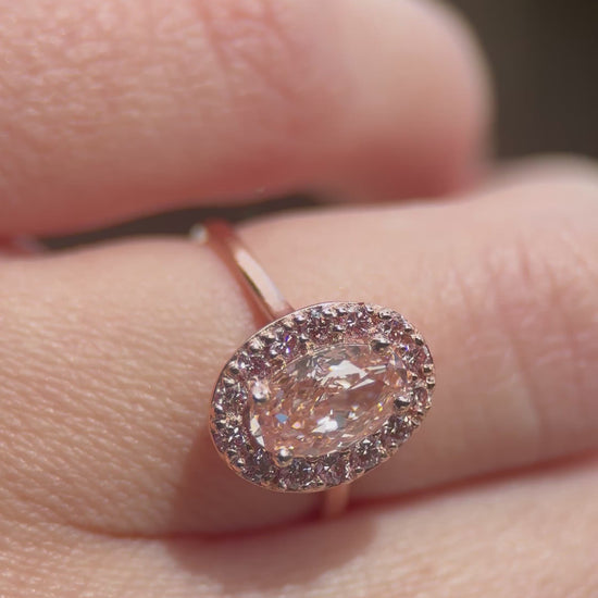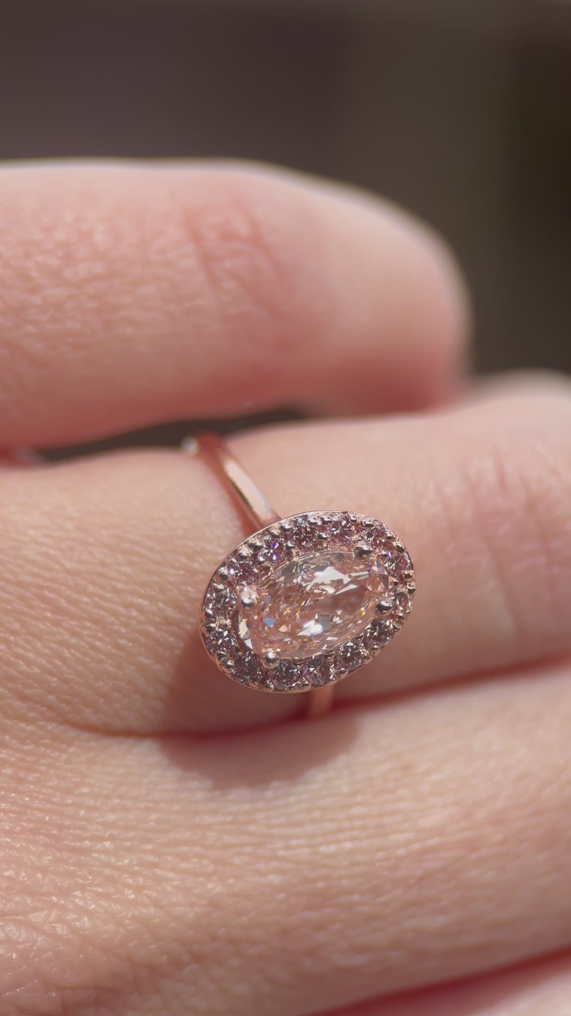 Diamante Lab Grown Certificado de 1.51 Cts corte Oval Fancy Intense Pink con halo de diamantes rosa naturales de .03 cts c/u.