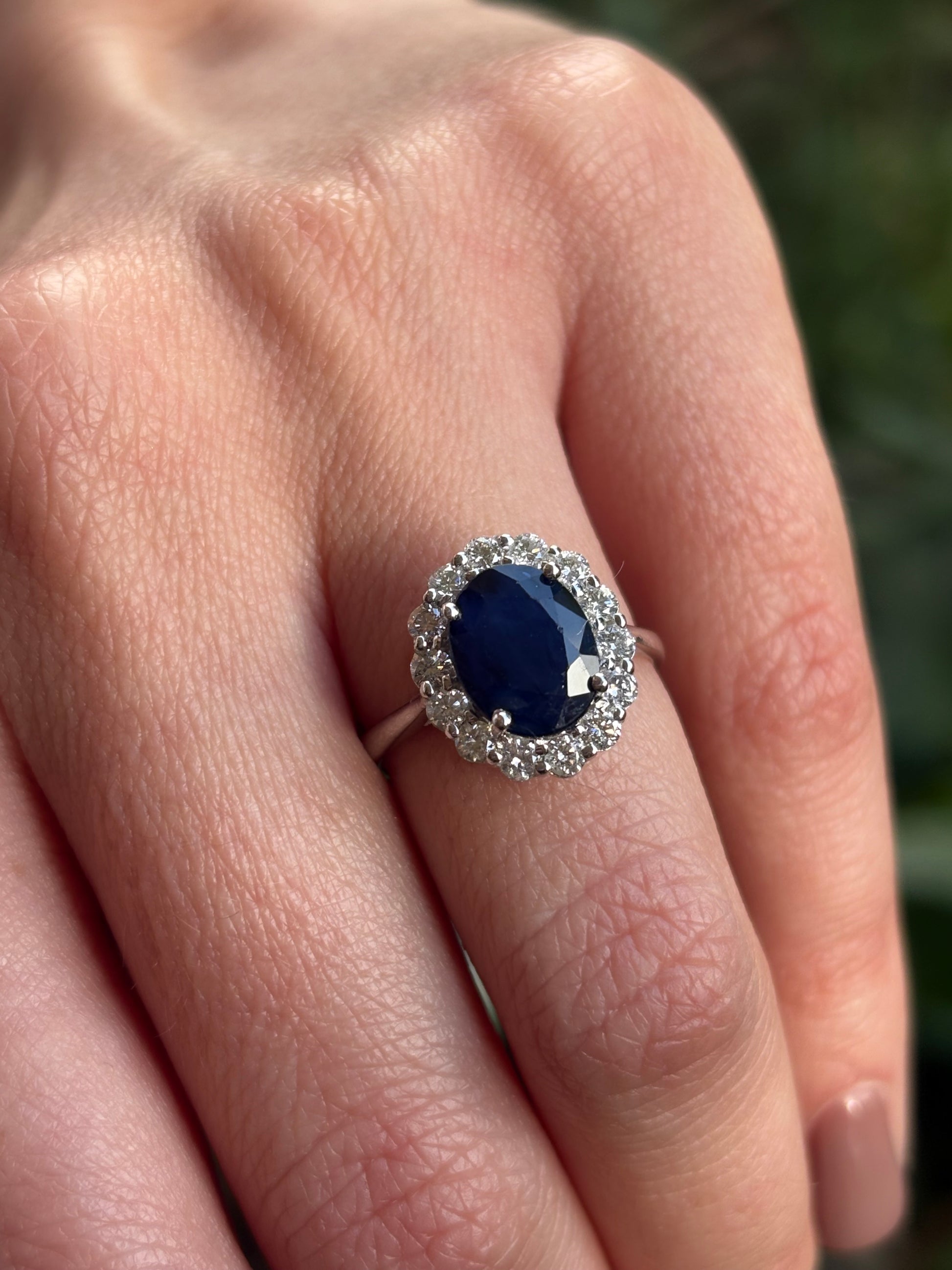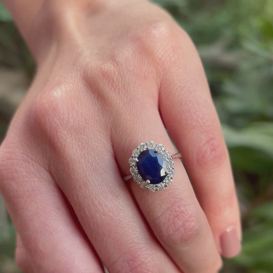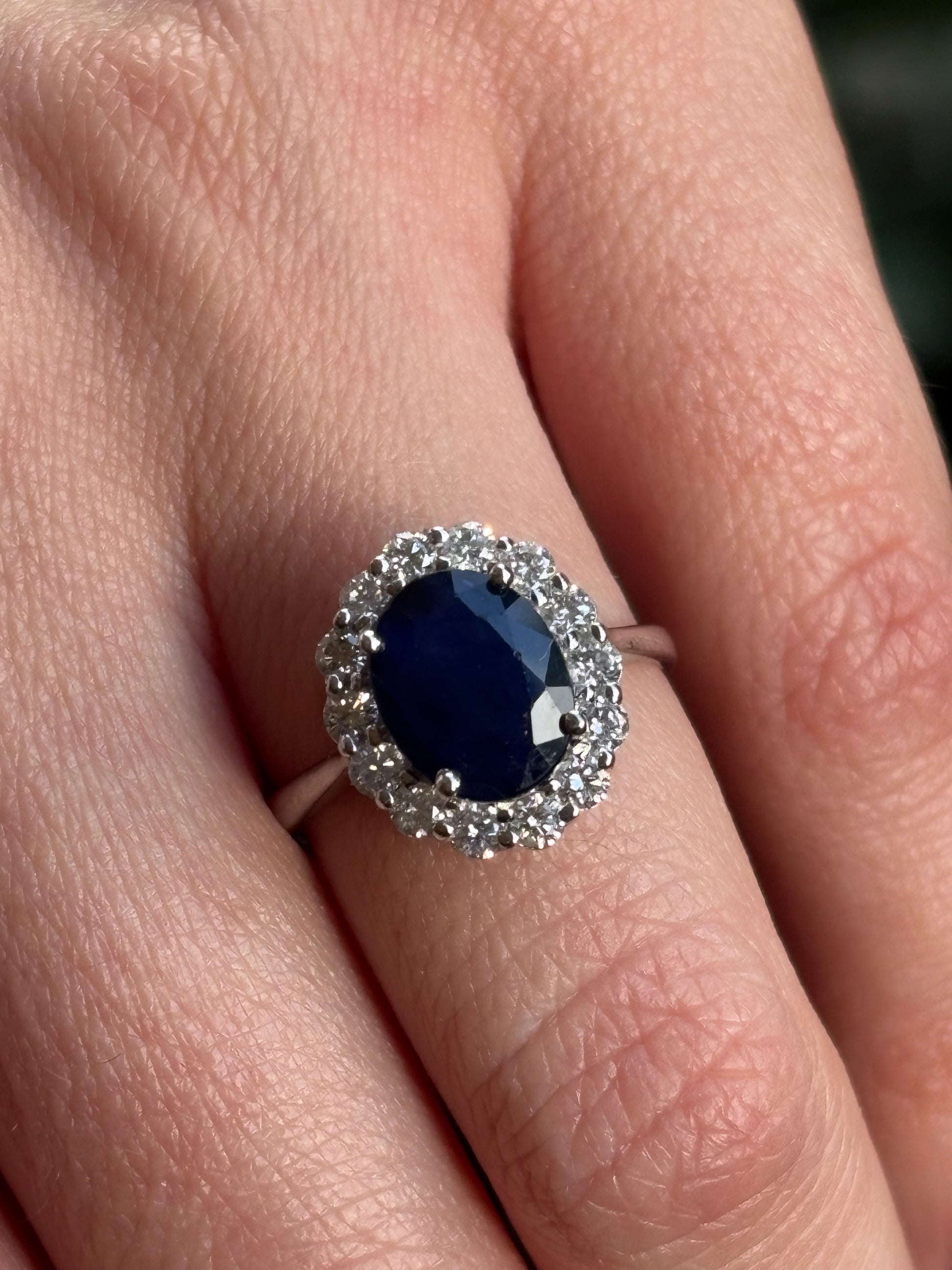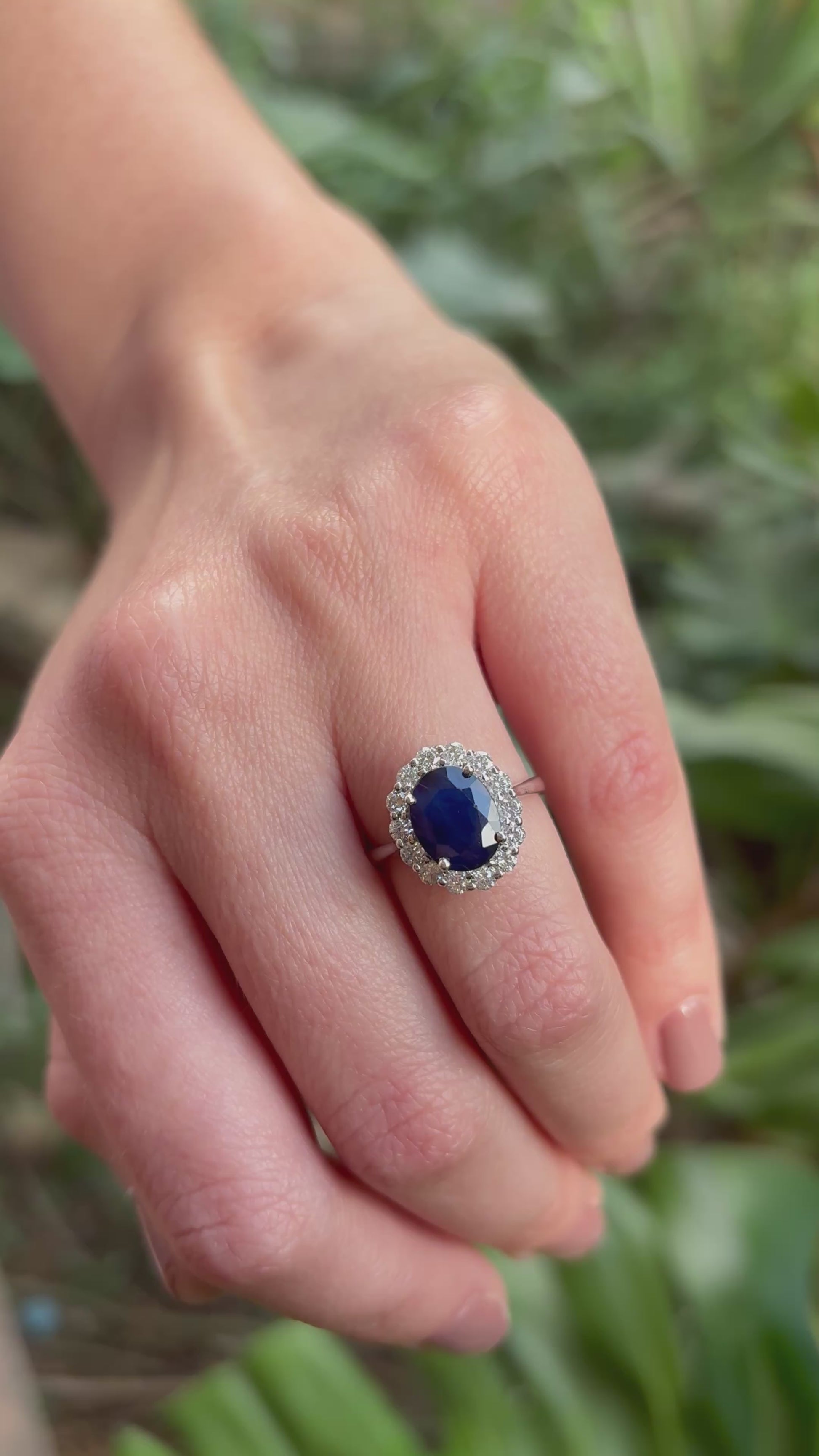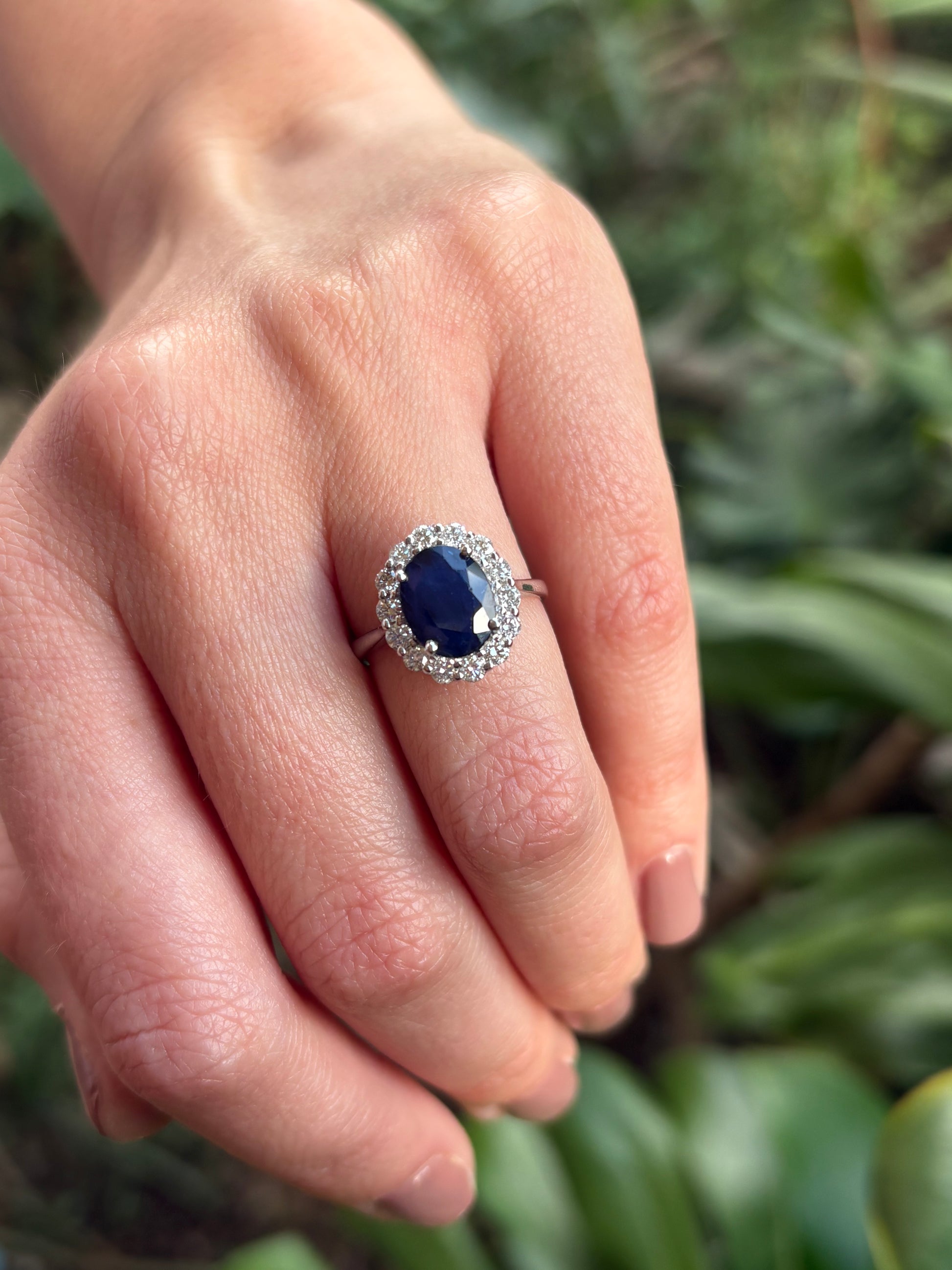 Zafiro oval de Madagascar 10x8 mm y halo de .70 Cts en diamantes.
