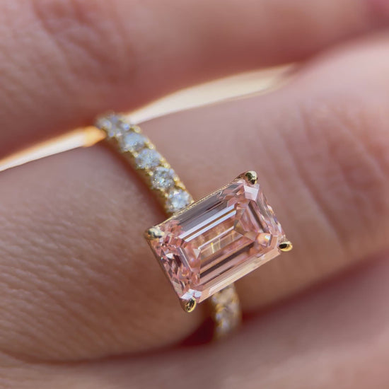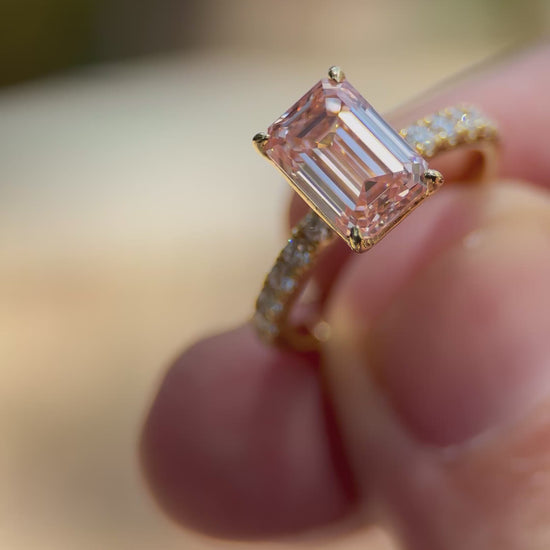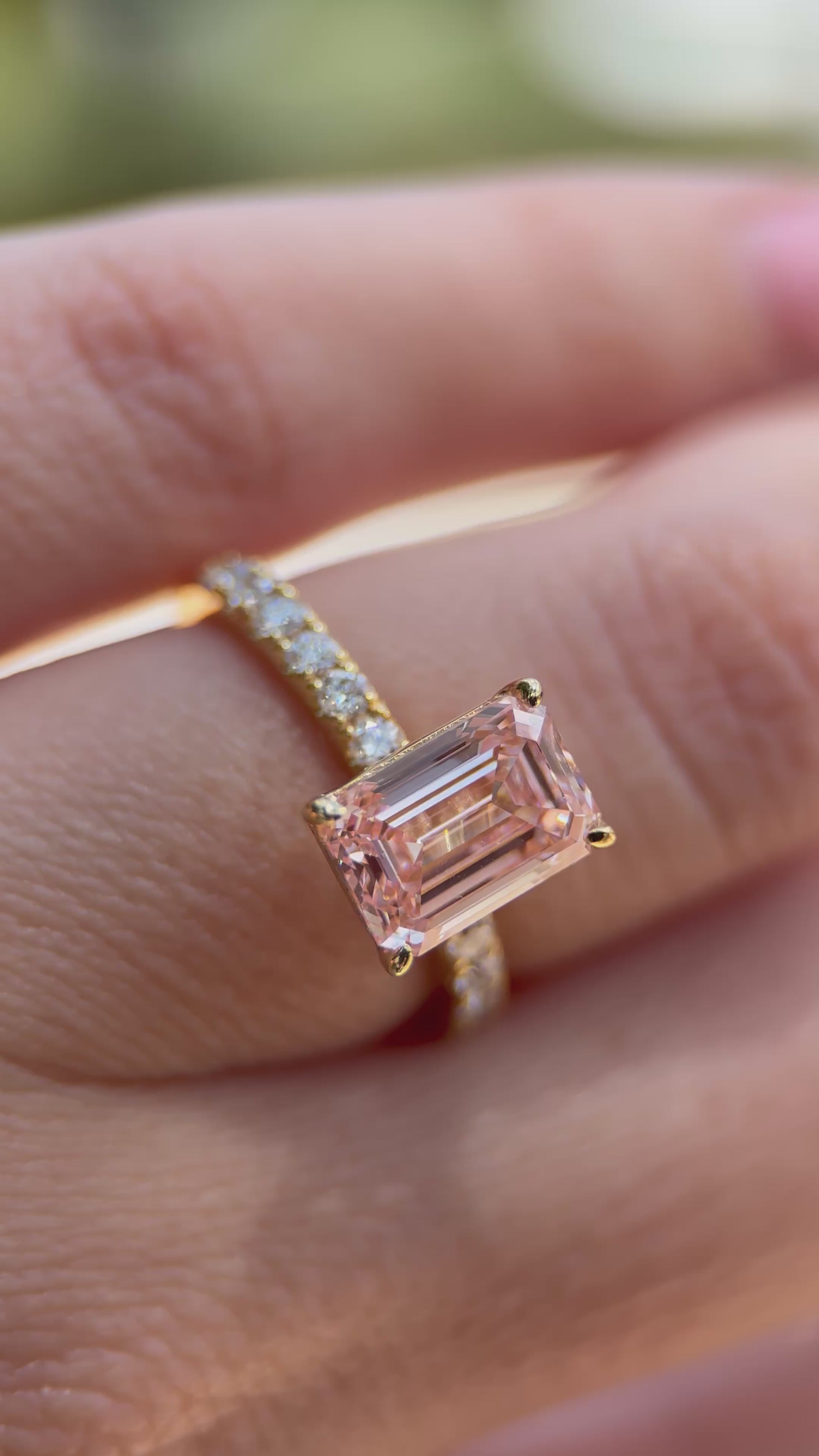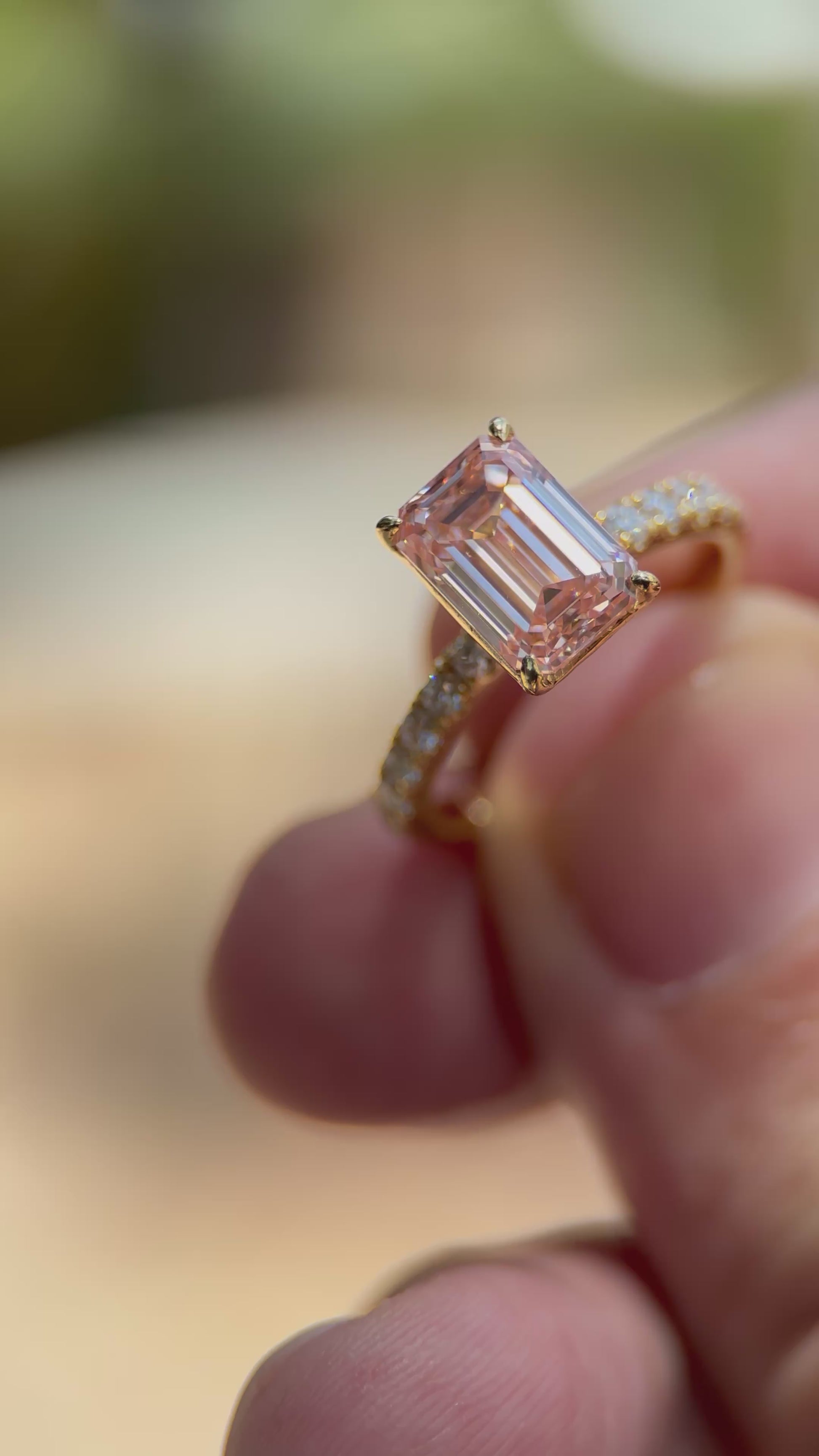 Diamante Lab Grown Certificado de 3 cts corte Esmeralda Vivid Pink con pavé de diamantes naturales de .03 cts c/u.